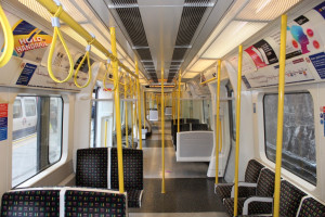 S8 von innen mit Blick vom Übergang auf Führerstand. Die S8 haben gemischte Quer- und Längssitze, die S7 haben nur Längssitze. |