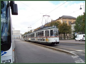 So kommt es, daß die Straßenbahnfahrer auf der Linie 2 an den Endstationen ein Pappschildchen umdrehen müssen. 412 hatte in jenem Augenblick einen sehr ordentlichen Fahrer: erstens hat er das Schild nicht einfach weggeräumt um es nicht undrehen zu müssen und zweitens hat er es ordnungsgemäß an die korrekte Stelle aufgehängt. Zum Zeitpunkt, zu dem das Foto entstand, wurde die Linie 2 über Stadttheater umgeleitet. |