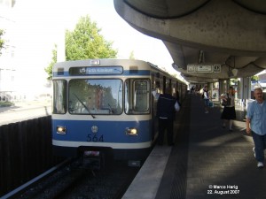 Ein Münchner U-Bahnwagen des Typs A rollt in Form eines Vollzugs (=2 Doppeltriebwagen) in die Station Messe im Süden der Linie U1 ein. |