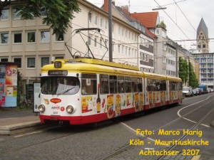 Zu sehen ist die alte Maggi-Bahn der KVB, die an diesem Sonntag mit anderen A5 zum Stadionverkehr eingesetzt war. |