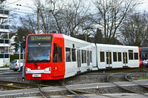 Niederflurwagen 4100 hat eine Neulackierung in die aktuellen KVB-Farben erhalten. Hier zu sehen auf der Kreuzung Neusser Straße/Wilhelm-Sollmann-Straße am 29.01.2015. |