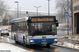 Heute ließ sich der Exot mal wieder blicken. Spuckte Fahrgäste aus und verschwand wieder dahin, wo er offenbar die meiste Zeit verbringt, nämlich auf dem Betriebshof. Da man ihn wenn überhaupt nur morgens/vormiitags ab und zu mal zu sehen bekommt, scheit er lediglich als Reservewagen hier zu sein. Die meisten anderen NL263er hat die RVK ja jetzt ihren Subunternehmern vermietet... |