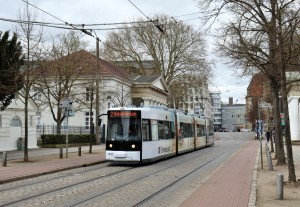 Auch 3042 ist in weiß mit Brebau-Werbung unterwegs. Die Bahn trägt unter der Folie den roten Kopf.