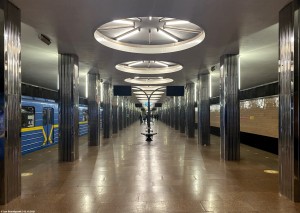 An die kurze Bahnhofshalle schließt sich die Einfahrt in den Tunnel nach Arsenalna an. Die LED-Anzeige unter dem Spiegel erinnert den Fahrer daran, dass der Bahnsteig rechts ist - das ist nämlich in Kiew sonst so gut wie nie der Fall.