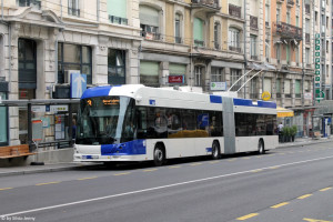 Infolge zweier Grossbaustellen, wovon, die eine bei der Grand-Pont beendet ist, wurde das Trolleynetz von Lausanne massiv verändert. Viele Linien wurden verlängert, resp. abgeändert, so dass oftmals entsprechende Fahrleitungen fehlen. Die 2. Serie der Lightram®19 wurde nun mit Kennzeichen ausgestattet, da der fahrdrahtunabhängige Betrieb gewisser Linien teilweise die Marke von 50% überschritten hat. Auch hier am Bahnhof von Lausanne müsste der Wagen der Linie 21 wieder eindrahten. Aufgrund des links zu sehenden unvorteilhaft geparkten Lkw's war dies nicht möglich. Dank der grosszügig bemessenen Traktionsbatterie kann die Fahrt auch ohne Probleme mit gesenkten Stromabnehmer fortgesetzt werden. |