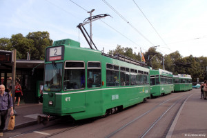 Nach zwei Entgleisungen beim Bankverein mit Anhängerzügen und 2 Motorwagen untersagte die BVB Kompositionen mit dem mittig angeordneten Anhänger. Deshalb entstanden für die Linie 2 diese eher ungewohnten Be4/4+Be4/4+B4-Züge. |