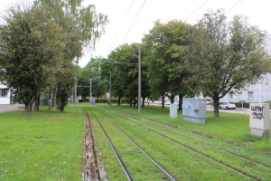Von Peuerbachstraße in Richtung Linke Brückenstraße im August 2025 vom stadtauswärtigen Gleis aus gesehen. Einige Meter weiter östlich wird sich künftig die Tunneleinfahrt nach Linz Urfahr-Ost befinden. |