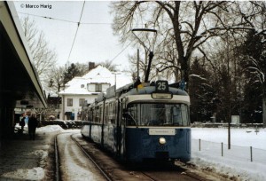 Hier eine etwas ältere Aufnahme (Scan) von dem Wagen 2012 auf der Linie 25 in Grünwald. Der Wagen steht mittlerweile abgestellt im Betriebshof und staubt vor sich hin... |