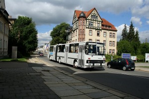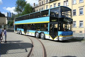 Als Zubringer zum Straßenbahnfest (und Braustolzfest) pendelte aller halbe Stunde ein Fahrzeug der Straßenbahnfreunde Chemnitz e.V. zwischen Museum und Zentralhaltestelle. Zur vollen Stunden fuhr ein Ikarus 280, zur halben Stunde der im Foto abgebildete Lowa Tw 801. |