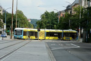Wegen Bauarbeiten an der Strecke zum Hauptbahnhof enden die Linien 1 und 2 an der Zentralhaltestelle (Tietz) und wenden über Annaberger Straße und Annenstraße. |