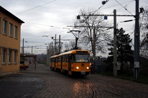 Diese Bahn hat soeben den Kapellenweg überquert und überquert gleich die Meißner Straße um in die Haltestelle Johannisbergstraße einzufahren. |