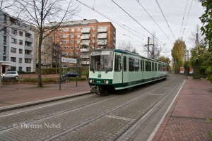 Sonderfahrt des HVSWB mit TW 7576 auf der Strecke der 1994 eingestellten Linie 64 (bis 1987 Linie H) von Bonn Hbf über Beuel nach Königswinter. |