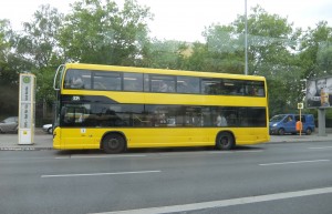 Dieser Nachbau des Robert-Kaufmann-Doppeldecker steht als Stadtrundfahrtbus am Brandenburger Tor bereit. |