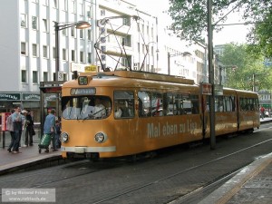 Hier ein älteres Bild von Wagen 3774, der eine Zeitlang unter der Wagennummer einen witzigen Aufkleber "4WD" trug. Auch sieht man hier die alte Lackierung mit der Kirschbaum-Werbung. Später war er einfach rot/weiß und war der Abschiedszug am letzten Tag der Linie 6. Davon gibt's ja garantiert hier schon Fotos; deshalb habe ich dieses ältere Bild des Zuges herausgesucht.