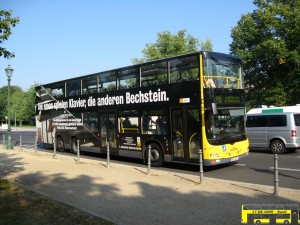 Wg. 3289 präsentiert als M48 an der Endstelle Alexanderplatz seine neue Werbung für den Lichter-Lauf im Oktober. |