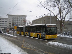 Die Busse der Schnellbuslinien 200 und 444 verbringen ihre Pause jeweils in der Ulmbergstrasse vis-a-vis des Bhf. Zürich Enge. Bei der Linie 444 ist die Betriebsführung kompliziert. Die Konzession ist bei der BDWM (Bremgarten Dietikon Wohlen Meisterschwanden Bahn), der Auftrag wurde an Postauto vergeben. Da aber im Kanton Aargau die Fahrezeuglackirung vom Kanton vorgeschriben wird, erkennt man nur noch am Hinweis an der Tür und an der Inneneinrichtung, das es sich hier um ein Poschti handelt. |
