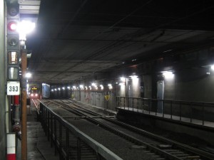 Die letzten Minuten des eingleisigen Betriebs vor der Wochenendsperrung. Links im Hintergrund wartet die 66 auf die ausfahrende 63. |