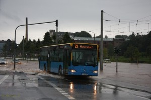 Am 7.8.10 war wegen des Hochwassers die Zwickauer Straße für die Straßenbahn unpassierbar. Für die Linie 2 Richtung Schönau wurde ein Ersatzverkehr eingerichtet, der anfangs über die Annaberger Straße führte. Gegen 9.40 Uhr wurde aber auch diese langsam überflutet. Wagen 216 war eines der letzten Fahrzeuge, bevor die Annaberger Straße ebenfalls gesperrt wurde. |