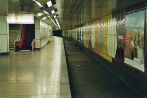 Der Bahnsteig der U2 Richtung Schlump vor dem Bau der U4 Anfang 2009 noch mit leerem Gleisbett der U4. Inzwischen liegen hier die Gleise der U4 in Richtung Hafencity. |