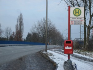 Die Kreuzung Horner Brückenweg/Billbrookdeich in Hamburg-Billbrook. Ein 02er Citaro der Hochbahn an der Haltestelle. |
