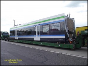 JKOY Sm5 94 10 208 1027-6, Autobahnraststätte Eichelborn A4, 15.05.2013, Pääkaupunkiseudun Junakalusto (JKOY) Finnland, Stadler Bussnang AG, CH Bussnang Schweiz, Stadler Rail Group, Mercedes-Benz Actros 3353, Kübler Spedition Schwäbisch Hall, Mittelwagen für Stadler Flirt Triebwagen |