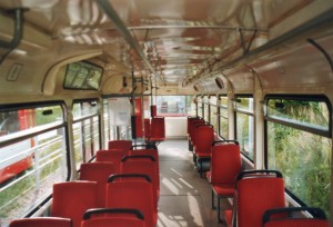 Tatra Triebwagen T4D von innen im Zustand der 1. Modernisierung mit Vogelsitzen. Die Anordnung der Sitze in Gruppen ist hier deutlich zu erkennen.