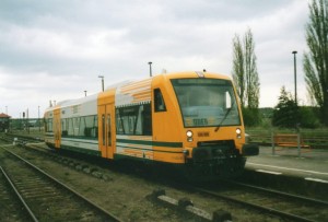 Im Frühjahr 2003 fuhren in Neustrelitz die Züge nach Mirow noch vom alten Südbahnsteig ab. 650 051 steht hier am 03.05.2003 in Neustrelitz am alten Südbahnsteig zur Abfahrt nach Mirow bereit.