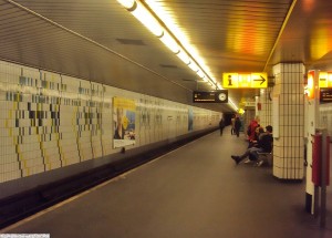 Linie G, Linie 9, U9, was auch immer. Irgendwo gab's mal ein Bild, wo hier kurz vor der Eröffnung 1961 ein "Zug" aus einem VW Käfer und angehängten Personenloren mit Besichtigungsgästen in den Bahnhof einfährt. |