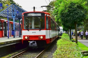 Rot/Grün gemischtes Doppel bestehend aus dem Museumswagen 2012 der Kölner Verkehrs-Betriebe AG (KVB) und dem Wagen 7752 der Stadtwerke Bonn (SWB) anlässlich einer Sonderfahrt im Betriebshof Bonn Beuel am 20.09.2014. |