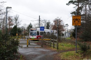 ist auf der Fahrt nach New Addington, nächster Halt Gravel Hill. Im Hintergrund befindet sich ein Wasserturm, auf dem Antennen von Vodafone für GSM und UMTS aufgestellt sind.