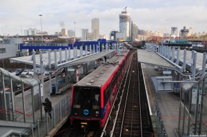 zwischen Heron Quays und Canary Wharf. Vom Bahnsteig Heron Quays aus aufgenommen... Hier sind die Haltestellenabstände wirklich nur so kurz...