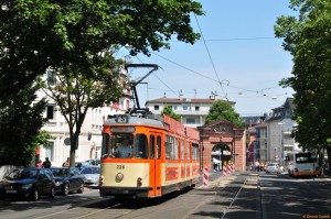 anlässlich "111 Jahre elektische Straßenbahn in Mainz" auf Pendelfahrt zwischen Am Gautor und Betriebshof unterwegs.