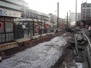 Die Baumstümpfe an der alten Haltestelle sind inzwischen mit Warnfarbe versehen worden, Fahrkartenautomat und Telefone sind verschwunden |