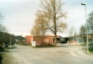 Vor dem früheren Betriebshof (norwegisch Trikkestall) Dalsenget wurde zur Erinnerung an die frühere Nutzung des Gebäudes ein altes Weichenstück aufgestellt. |