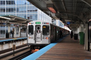 Green Line auf dem Weg nach Cottage Grove. Im südlichen Ende hat die Green Line zwei Enden, einmal östlich Cottage Grove, und westlich 63rd. Durch die farbliche Matrix lässt sich das Ziel schon von weitem erkennen: Grüne Schrift auf weißem Grund ist Cottage Grove, und weiße Schrift auf grünem Grund die 63rd. |