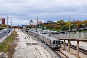 Gleiches Spiel, nur diesmal von der anderen Seite. Rechts der Zug steht in der Wende- und Abstellanlage zwischen den Haltestellen UIC-Halsted und Racine und wartet darauf, zum Flughafen O'Hare zurück zu fahren. Der linke Zug ist auf dem Weg zum Forest Park.