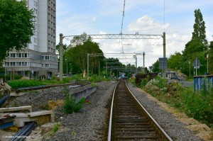 Der ehemalige eingleisige Abschnitt zwischen den Haltepunkten Brühl Süd und Brühl Mitte aufgenommen vom Bahnübergang Liblarer Straße am 22.07.2017 (Blickrichtung Brühl Süd). |