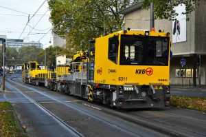 Der in Köln Klettenberg durch einen technischen Defekt gestrandete und nicht mehr fahrfähige Bonner Stadtbahnwagen 0370 gezogen vom Kölner Robel Gleiskraftwagen 6312 auf dem Weg in den Betriebshof West an der Haltestelle Gleueler Str./Gürtel am 13.11.2017. |