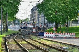 Die freigelegten Schienen des Bahnüberganges der Linie 4 auf dem Bergischen Ring in Mülheim am 20.05.2018. |