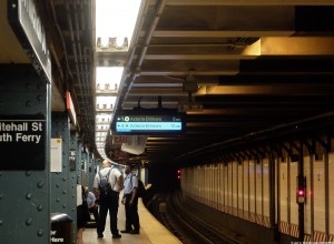 Das von beiden Seiten erreichbare Mittelgleis der Station. Tagsüber endet hier der W train und ab Mitternacht der aus Brooklyn kommende R train. Dieser wurde erst 2017 verlängert, vorher pendelte er im Nachtverkehr nur zwischen Bay Ridge-95th Street und 36th Street als Brooklyn Shuttle. Gelegentlich, wenn das Zugteam gut drauf war, sogar mit gelbem S. |