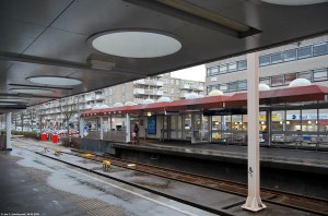 Erinnert irgendwie an Sylt. Auch wenn die Gebäude da nicht so hoch sind. Um nicht mit maximal 10 km/h einfahren zu müssen, geht die Strecke noch ein Stück hinter dem Bahnsteig weiter. Auch praktisch, um dort einen Zug abstellen zu können. |