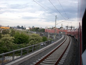 Blick aus dem Fenster des RE auf der längsten Bahnbrücke Berlins. |