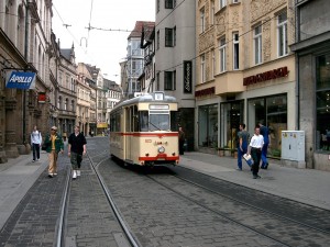 Hier steht der ET57 gerade vor der Kulisse, die sich am Hallenser Markt bietet, auch wenn es in Halle schön aussieht, 25% Arbeitslosigkeit haben 90.000Menschen bereits verjagt, wenn das so weiter geht, ist alle in 40Jahren ausgestorben. |