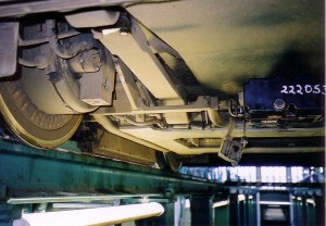 Blick auf die Elektronik unter dem Wagenboden zwischen den beiden Drehgestellen |