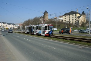 über den Dächern von Plauen zwischen den Haltestellen Carl-von-Ossietzky-Weg und Vogtlandklinikum. |