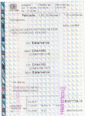 Wenn die Bahn keine Ahnung hat und nicht mehr durchblickt oder, so wörtlich, "die Sachlage nicht mehr nachvollziehen kann", bekommt man einen Kulanzgutschein KD, den man nicht im Internet, nicht am Bahnhofsschalter Elsterwerda, nicht bei dem telefonischen ReiseService einlösen kann. Toll. |