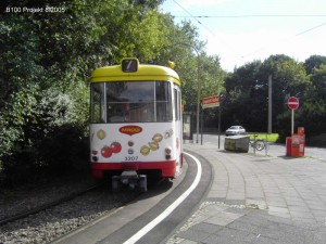 Zu sehen ist der Achtachser mit der Betriebsnummer 3207, aufgenommen im August 2005 an der Mauritiuskirche bei der Ausrückfahrt zum Ubierring über Neumarkt |