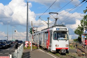 Na, und wem kommt dieses Bild nicht ein wenig bekannt vor? Richtig. Exakt an dieser Stelle hat bereits ein anderer Fotograf ein "Hintergrundbild" aufgenommen, um dort hinein einen HF6 zu setzen, um einen ersten Eindruck der neuen Hochflurflotte für Düsseldorf zu bekommen. Nur, dass ich hier einen realen Zug fotografiert habe, den GT8SU 3212, welcher durch den HF6 abgelöst wird. Und der Sonnenstand stimmt nicht richtig überein.