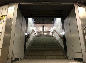 In dem Bereich, in dem die S-Bahn den U1-Tunnel unterquert, weicht die Wandgestaltung ab: Die Grundfarbe ist hier weiß und die Kreise sind ausschließlich gelb. Warum? Weil! |
