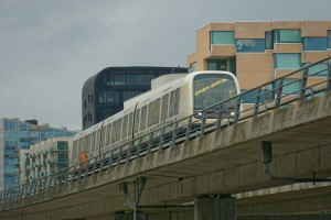 verlässt gerade den Bahnhof Ørestad. Hier besteht Anschluss an den Øresundstog. Die Baukräne im Hintergrund zeugen von den regen Bautätigkeiten in diesem Bereich.